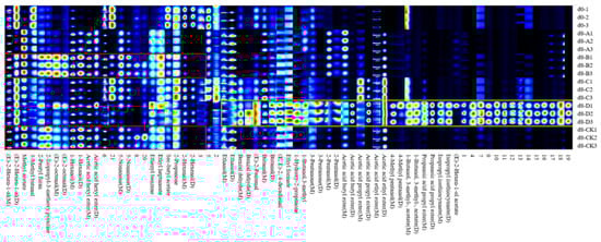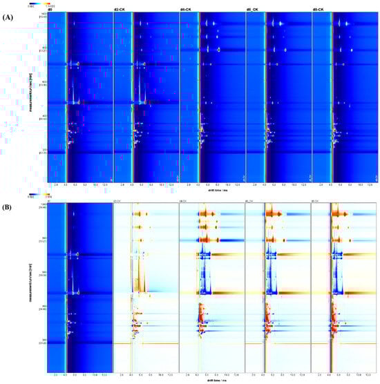 The volatile organic compounds (VOCs) of peach samples packaged with different preservation methods were characterized and analyzed by comparing their IMS retention indices and drift times to those of the control. To examine the effects of different packaging methods on the flavor compounds of peaches during storage, the baseline spectrum of freshly picked samples (group d0) was compared with that of samples stored for 8 days (Figure 5).