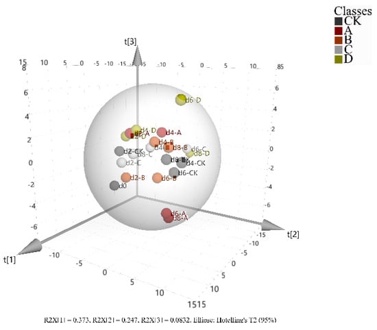 Principal component analysis (PCA) is a simplified method for analyzing multiple variables, with 3D visualization offering improved accuracy when handling a large set of interrelated original variables [49]. In this study, PCA was established based on the differences in signal intensity of volatile compounds among groups from 0 to 8 days (Supplementary Figure S1). The data from three parallel experiments per each group were averaged to create a single data point, facilitating observation and analysis. The PCA results indicate that the cumulative contribution rate of the three principal components is 70.3%, effectively explaining the correlations among the data of each group.