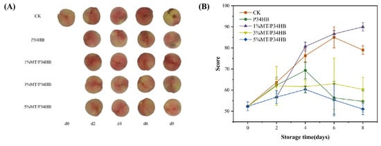 As shown in Figure 7A, peaches in the CK group gradually lost moisture at room temperature, with enzymatic browning due to peroxidation at the end of storage [50]. Except for the 1%MT/P34HB group, all other groups covered with the film exhibited slight local darkening on day 8 that was attributed to accelerated decay process from anaerobic respiration. This slight browning did not significantly affect the primary sensory attributes of the peaches, aside from appearance. Figure 7B presents a composite score evaluating appearance, flavor, firmness, juiciness, and sweet–sour balance of the samples. Peaches in the 1% MT/P34HB group maintained their sweetness and a soft texture, similar to those in the CK group, while retaining juiciness better than the CK group. As the 1% MT/P34HB peaches ripened within the packaging, their sensory score steadily increased, reaching approximately 90 points. In contrast, the exposed CK group experienced moisture loss and slight mold growth, leading to a slight decline in sensory score after storage. A similar phenomenon was observed in P34HB, 3% MT/P34HB, and 5% MT/P34HB groups, where ethanol production from excessive anaerobic respiration negatively impacted the taste and flavor of the peaches, resulting in scores between 50 and 70 points, and falling short of consumer expectations for soft, juicy, and flavorful peaches.