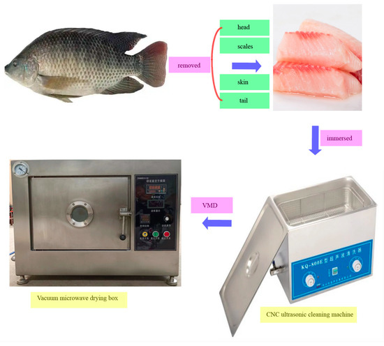 Tilapia, renowned for its palatability and nutritional value, has gained widespread popularity among consumers. However, the high moisture content (78–80%) of fresh tilapia fillets renders them susceptible to enzymatic and microbial degradation [1]. Drying has emerged as an effective preservation method to extend the shelf life of aquatic products. Current drying technologies for fish fillets encompass heat pump drying [2], hot air drying [3], microwave drying [4], and vacuum freeze drying [5]. Heat pump drying, characterized by its energy efficiency, utilizes latent heat from water vapor during the drying process, minimizing heat loss. Despite its energy-saving advantages, this method exhibits limitations, including slow drying rates, substantial equipment investment, restricted applicability, and stringent environmental humidity control requirements [6]. Conversely, hot air drying suffers from inherent drawbacks, such as low drying efficiency, limited automation, slow heat transfer, significant degradation of heat-sensitive components, and inferior product quality [7]. Vacuum freeze drying effectively preserves color, aroma, flavor, nutrients, and bioactive components, while inhibiting microbial growth and maintaining enzymatic activity [8]. However, it is limited by high capital investment, operational costs, discontinuous processing, significant energy consumption, and elevated product prices [9,10]. To overcome the limitations of individual drying technologies, researchers have increasingly adopted combined drying approaches [11,12,13]. For instance, the integration of heat pump and vacuum freeze-drying technologies for shiitake mushrooms resulted in a 37.69% reduction in energy consumption compared to standalone vacuum freeze drying, while significantly enhancing product quality relative to heat pump drying [14]. Similarly, Antarctic krill processed using this combined approach demonstrated comparable quality to vacuum freeze-dried products, with a 50% reduction in drying time compared to individual methods [15]. Vacuum microwave drying (VMD) technology capitalizes on the reduced boiling point of water under vacuum conditions [16], facilitating simultaneous heat and mass transfer. This dual mechanism enables rapid drying, superior product quality, and enhanced process control [17]. The optimization of food drying processes emphasizes two critical parameters: product quality and energy efficiency. Recent studies have demonstrated the efficacy of combining osmotic dehydration with VMD in food applications [18,19,20].