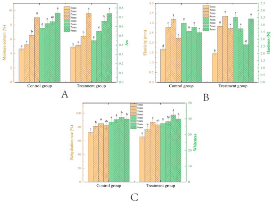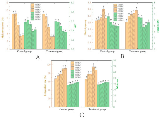 Changes in moisture content ((A), %) and, Aw (A); elasticity ((B), mm) and, hardness ((B), N); rehydration ((C), %) and whiteness (C) of tilapia fillet samples with different thickness conditions after VMD. The means between drying methods on the same thickness with different lowercase letters (a–d) differ significantly (p < 0.05).