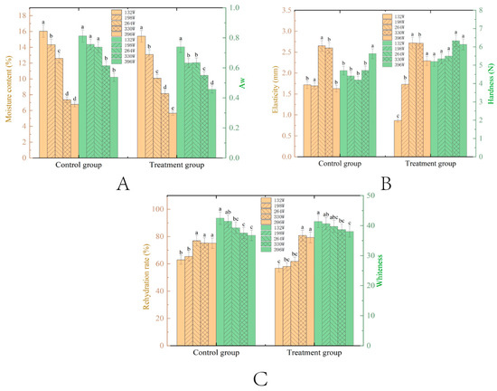 Changes in moisture content ((A), %) and Aw (A); elasticity ((B), mm) and hardness ((B), N); rehydration ((C), %) and whiteness (C) of tilapia fillet samples with different thickness conditions after VMD. The means between drying methods under the same power conditions with different lowercase letters (a–d) differ significantly (p < 0.05).