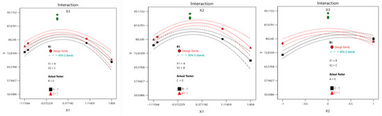 Interaction diagram can directly reflect the interaction between factors. In this experiment, Design-Expert 13 interactive descriptor platform is used to carry out inter-factor transactional analysis on the vested regression model (2). If there is no intersection between the vertical and horizontal between the two factors, it means that there is no interaction between the two factors. If there is intersection, it means that there is interaction between the two factors. As can be seen from Figure 5, there is a cross between and , which shows that microwave power and vacuum degree have significant effects on the quality of dried tilapia fillets within the experimental range (p < 0.05).