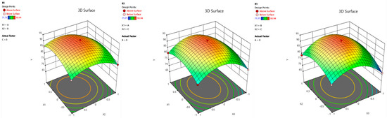 After the significance test of model Equation (7), the interaction items between and , and are not significant (p > 0.05), and the optimized regression model is established after elimination.