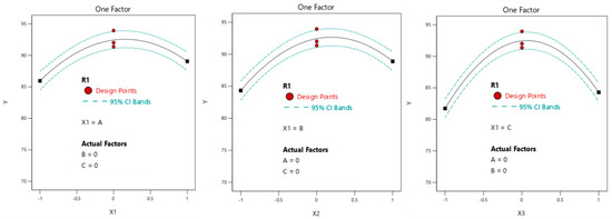 Because the variables in the regression model Equation (8) are coded values, it is necessary to bring the mathematical expressions of coded values in Table 2 into the model. This includes the actual mathematical expressions of the quality score y of tilapia fillets dried by vacuum microwave and the fillet thickness , microwave power , and vacuum as shown in Equation (9):