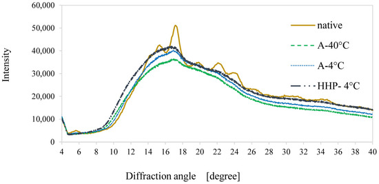 X-ray diffraction (XRD) of native potato starch granules (Native ˗˗˗˗˗) and retrograded starch after autoclaving and retrogradation at 40 °C (A-40 °C ˗ ˗ ˗ ˗ ˗), 4 °C (A-4 °C ․․․․․) or starch treated by HHP followed by 4 °C retrogradation (HPP-4 °C ▬ ▪ ▪ ▬). Patterns with typical B-type polymorph peaks at the 2θ of 17°, moderate intensity peaks at the 2θ of 15°, 22°, and 24°, and a characteristic peak at about 5.6° 2θ. All processed starch samples exhibited a complete disappearance of the 2θ of 5.6°.
