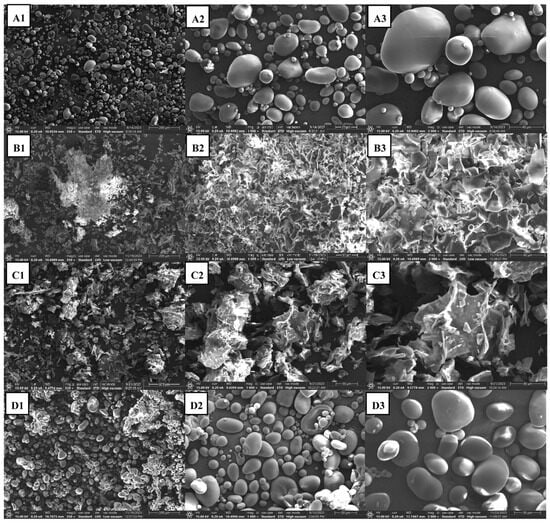 SEM micrographs of (A) smooth roundish granules of native potato starch at magnifications of (A1) ×350, (A2) ×1000, (A3) ×2000; (B) flaked starch after autoclave processing followed by a retrogradation at 40 °C for 24, at magnifications of (B1) ×350, (B2) ×1000, (B3) ×2000; (C) flaked starch after autoclave processing followed by a retrogradation at 4 °C for 24, at magnifications of (C1) ×350, (C2) ×1000, (C3) ×2000; (D) defected roundish starch granules after HHP processing followed by a retrogradation at 4 °C for 24 at magnifications of (D1) ×350, (D2) ×1000, (D3) ×2000.