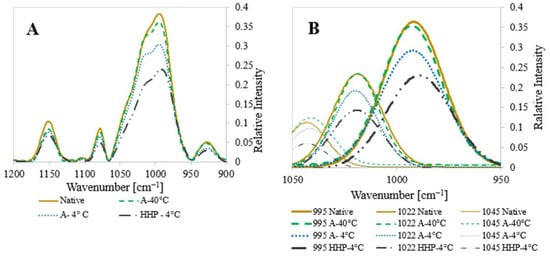 (A) FTIR spectrum between 900 and 1200 cm−1 of native starch (˗˗˗˗˗) and processed potato starch autoclaved and retrograded at 40 °C (˗ ˗ ˗ ˗ ˗); autoclaved and retrograded at 4 °C (․․․․․); and processed by HHP and retrogradation at 4 °C (▬ ▪ ▪ ▬). (B) Deconvoluted spectrum for the peaks at 995 cm−1, 1022 cm−1, and 1045 cm−1.