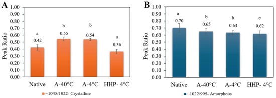 FTIR peak ratios indicative of (A) amorphous (wavenumber 1022/995R) regions and (B) crystalline regions (wavenumber 1045/1022R) of native starch, A-40 °C, A-4 °C, and HHP-A-4 °C. Statistically significant values are denoted by letter where p < 0.05 (n = 9).