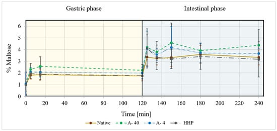 The in vitro digestion of starch expressed in terms of %maltose released as a function of time during gastric and small-intestinal digestion. For native potato starch (Native ˗˗˗˗˗); autoclaved and retrograded at 40 °C (A-40 ˗ ˗ ˗ ˗ ˗); autoclaved and retrograded at 4 °C (A-4 ․․․․․); processed by HHP and retrogradation at 4 °C (HHP▬ ▪ ▪ ▬), according to an adapted protocol for semi-dynamic digestion based on the INFOGEST protocol. (n = 3).