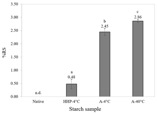 %RS (w/w) content obtained from Native potato starch, potato starch autoclaved and retrograded at 40 °C potato starch autoclaved and retrograded at 4 °C, and potato starch processed by HHP and retrogradation at 4 °C. Statistically different values denoted with letters where p < 0.005 (n = 4).