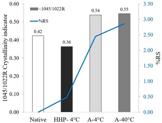Concurrence between FTIR indicator of starch crystallinity (ratio of wavenumbers 1045/1022R) and %RS obtained for Native potato starch, potato starch autoclaved and retrograded at 40 °C, potato starch autoclaved and retrograded at 4 °C, and potato starch processed by HHP and retrogradation at 4 °C.
