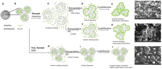 Illustration of the changes occurring during starch processing. (A) Starch granule concentric ring model, (B) starch granules composed of amylose and amylopectin, (C) during autoclaving starch granules swell and amylose chains leach to the bulk, (D) during retrogradation at 40 °C amylose chains are orderly deposited on the disrupted granules. Some amylose chains remain free in the bulk; (E) after lyophilizing, amylose chains that were in the bulk are intercalated between the disrupted granules; (F) during retrogradation at 4 °C amylose chains are less mobile and are deposited on the starch granules in a less orderly manner; (G) after lyophilizing, amylose chains remaining in the bulk are intercalated between to the disrupted granules; (H) during HHP, the structure of starch granules remains mostly intact, with limited leaching of amylose chains; (I) during retrogradation of HHP process starch at 4 °C fewer amylose chains (compared to thermally processed starch) are deposited on the starch granules; (J) after lyophilization, low levels of amylose chains present in the bulk become loosely attached to the granules.