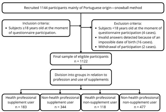 This cross-sectional study was conducted among the adult Portuguese population, who were invited to participate in answering a questionnaire. A flowchart showing the subjects of this study is provided in Figure 1. Data were collected between 30 June and 30 September 2023. The snowball sampling method, a non-probabilistic sampling method, was used to enrol the study participants, whereby participants helped spread the word, recruiting additional respondents. The method was described previously [22]. First, this study was published on the author’s personal and professional social media channels (i.e., LinkedIn®, Facebook®, and Instagram®), and requests were sent by discussion forums, professional organisations, mailing lists of students and teachers, and human resources departments of several national companies. The importance of sharing was reinforced in all requests on participants’ personal and professional social networks and also in professional and personal WhatsApp® groups. This way, the chance of reaching a more diverse population increased. The investigators extended invitations to eligible participants who indicated their interest in participating in this study, which allowed them to fill out an online self-administered questionnaire.