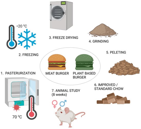 Standard animal chow was purchased from the “Cantacuzino” National Institute for Medical and Military Research and Development in Bucharest. The burgers were kept in the freezer until processing. This involved vacuum sealing in plastic bags, pasteurization at a temperature of 70 °C within the product, and then freezing at −20 °C. The frozen burgers were lyophilized, ground into powder, homogenized with standard chow, and then pelleted. The animal chow was prepared similarly to other studies in the literature [20], with the steps being schematically presented in Figure 1.