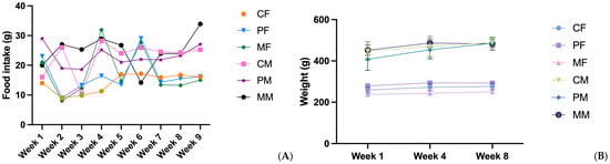 The carbohydrate caloric intake of meat products differs significantly from that of vegetable products (0.1 g/100 g compared to 5.8 g/100 g), which is attributed to the need to add different types of starch to achieve the desired consistency and composition. Studies show that plant products have a higher degree of satiety compared to meat analogues [47]. Even considering that the total amount of food consumed/day was not different between animals of the same sex in the studied groups, an increase in weight was observed in the PM group.