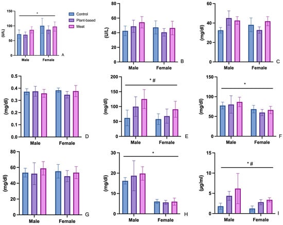 Graphical representation of (A) aspartate aminotransferase, (B) alanine aminotransferase, (C) urea, (D) creatinine, (E) triglycerides, (F) total cholesterol, (G) HDL—cholesterol, (H) LDL—cholesterol, and (I) leptin values after 60 days of feeding with standard diet or feed improved with meat or PBM burgers. *—indicates gender effect, #—indicates diet effect.