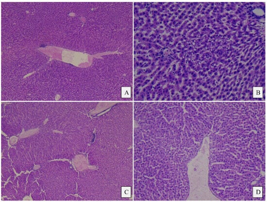 Histopathological images of the liver from the control and plant-based groups: (A) Control, male, minimal area of centrilobular inflammatory infiltrate, 5×; (B) Control, female, small area of microvacuolar fatty dystrophy, 20×; (C) Plant-based group, male, minimal area of intraparenchymal inflammatory infiltrate, 5×; (D) Plant-based group, male, microvacuolar dystrophy, 10×.