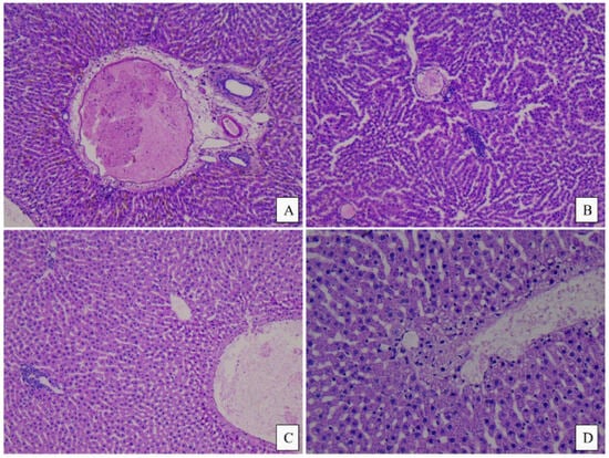Histopathological aspects of the liver in the meat group: (A) Female, normal-appearing port space with rare plasma cells at this level, 10×; (B) Female, intraparenchymal inflammatory infiltrate, 10×; (C) Male, minimal periportal inflammatory infiltrate and microvacuolar fatty dystrophy, 10×; (D) Male, microvacuolar fatty dystrophy, 20×.