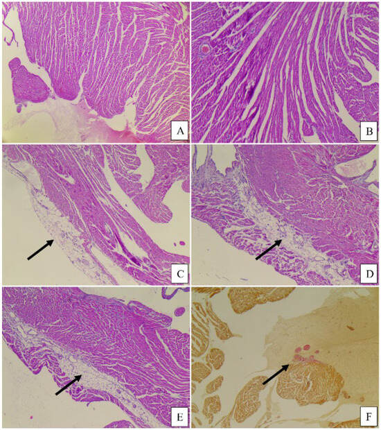 Cord histopathological aspects: control, plant-based, and meat groups, hematoxylin–eosin staining: (A,B) Control, male, myocardial tissue of normal histological appearance, 5× (A), 10× (B); (C,D) Plant-based, 2 cases, with subepicardial adipose tissue (C) and intramyocardial adipose tissue (arrow), (D) 5×; (E,F) Meat, 2 cases, intramyocardial adipose tissue, 5× (E), and minimal area of subendocardial fibrosis highlighted in van Gieson stain, 5× (F).