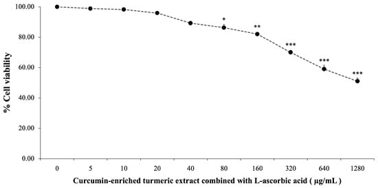 The cytotoxicity of curcumin-enriched turmeric extract and L-ascorbic acid was assessed by treating SH-SY5Y cells with concentrations ranging from 0 to 1280 µg/mL for 24 h. As illustrated in Figure 1, cell viability declined with increasing concentrations, from 99.84 ± 1.47% at 5 µg/mL to 51.03 ± 2.03% at 1280 µg/mL. Significant cytotoxic effects were observed at 80 µg/mL and higher (p < 0.05 at 80 µg/mL; p < 0.01 at 160 µg/mL; p < 0.001 at 320 µg/mL and above).