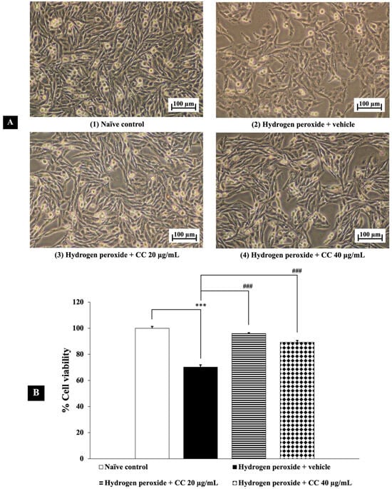 Neuroprotective effects of curcumin-enriched turmeric extract combined with L-ascorbic acid on H2O2-induced oxidative damage in SH-SY5Y cells. (A) Representative images of SH-SY5Y cell density at 10× magnification. (B) Percentage of cell viability. Data are presented as the mean ± SEM. *** p < 0.001; compared with the naïve control group, ### p < 0.001; compared with the H2O2 and vehicle-treated group. H2O2: 200 µM hydrogen peroxide; CC: curcumin-enriched turmeric extract combined with L-ascorbic acid.