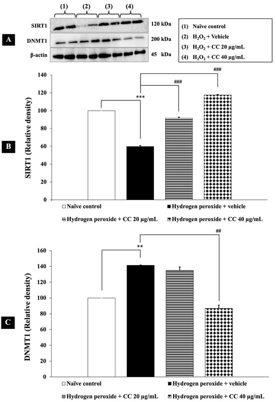 Effect of curcumin-enriched turmeric extract combined with L-ascorbic acid on epigenetic modulation in oxidative stress-induced SH-SY5Y cell damage. (A) Immunoblot showing the expression of SIRT1 and DNMT1. (B) Relative density of SIRT1, normalized to beta-actin. (C) Relative density of DNMT1, normalized to beta-actin. Data are presented as the mean ± SEM. **, *** p < 0.01 and 0.001, respectively; compared with the naïve control group, ##, ### p < 0.01 and 0.001, respectively; compared with the H2O2 and vehicle-treated group. H2O2: 200 µM hydrogen peroxide; CC: curcumin-enriched turmeric extract combined with L-ascorbic acid.