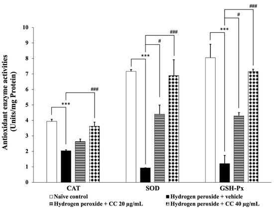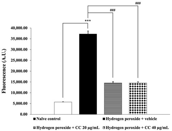 Effect of curcumin-enriched turmeric extract combined with L-ascorbic acid on ROS generation in oxidative stress-induced SH-SY5Y cell damage. Data are presented as the mean ± SEM. *** p < 0.001; compared with the naïve control group; ### p < 0.001; compared with the H2O2 and vehicle-treated group. H2O2: 200 µM hydrogen peroxide; CC: curcumin-enriched turmeric extract combined with L-ascorbic acid.