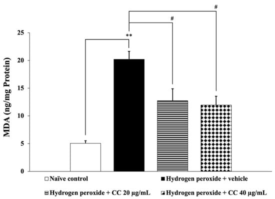 Effect of curcumin-enriched turmeric extract combined with L-ascorbic acid on MDA level in oxidative stress-induced SH-SY5Y cell damage. Data are presented as the mean ± SEM. ** p < 0.01; compared with the naïve control group; # p < 0.05; compared with the H2O2 and vehicle-treated group. H2O2: 200 µM hydrogen peroxide; CC: curcumin-enriched turmeric extract combined with L-ascorbic acid.