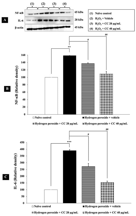 Effect of curcumin-enriched turmeric extract combined with L-ascorbic acid on inflammatory markers in oxidative stress-induced SH-SY5Y cell damage. (A) Immunoblot showing the expression of NF-κB and IL-6. (B) Relative density of NF-κB, normalized to beta-actin. (C) Relative density of IL-6, normalized to beta-actin. Data are presented as the mean ± SEM. **, *** p < 0.01 and 0.001, respectively; compared with the naïve control group, #, ## p < 0.05 and 0.01, respectively; compared with the H2O2 and vehicle-treated group. H2O2: 200 µM hydrogen peroxide; CC: curcumin-enriched turmeric extract combined with L-ascorbic acid.