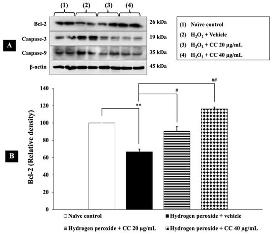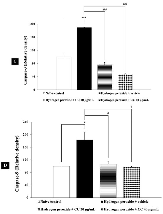 Effects of curcumin-enriched turmeric extract combined with L-ascorbic acid on apoptotic markers in H2O2-induced oxidative damage in SH-SY5Y cells. (A) Immunoblot showing the expression of Bcl-2, caspase-3, and caspase-9. (B) Relative density of Bcl-2, normalized to beta-actin. (C) Relative density of caspase-3, normalized to beta-actin. (D) Relative density of caspase-9, normalized to beta-actin. Data are presented as the mean ± SEM. *, **, *** p < 0.05, 0.01, and 0.001, respectively; compared with the naïve control group, #, ##, ### p < 0.05, 0.01, and 0.001, respectively; compared with the H2O2 and vehicle-treated group. H2O2: 200 µM hydrogen peroxide; CC: curcumin-enriched turmeric extract combined with L-ascorbic acid.