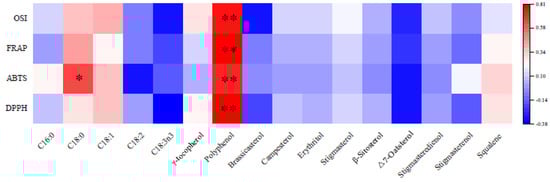 Figure 1 elucidates the intricate relationships between various compounds and their impact on antioxidant activities in OSI, FRAP, ABTS, and DPPH assays. The results indicate a strong positive correlation between polyphenols and all measured antioxidant activities. This suggests that polyphenols could significantly mitigate oxidation. In contrast to polyphenols, γ-tocopherol might not show a significant correlation with antioxidant activities. This absence of a strong relationship suggests that while γ-tocopherol has recognized antioxidant properties, its impact might be less pronounced or more context-dependent than polyphenols. The fatty acids and sterols might show a weak correlation with antioxidant activities.