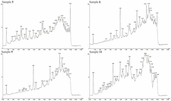 To elucidate the phenolic composition of IWO, UPLC-QTOF-MS analysis was conducted on samples 5, 6, 9, and 11, which exhibited the highest polyphenol content. The main polyphenols in IWO were identified by database screening and comparison of retention times, accurate mass, and fragment ions by authentic standards. The total ion chromatograms, depicted in Figure 2, revealed distinct variations among the four spectra, indicating diverse polyphenolic profiles across the IWO samples. Preliminary spectral analysis, supplemented by UV and MS data, identified nineteen phenolic entities, encompassing twelve phenolic acids, two lignans, two flavonoids, and three sesquiterpenes, as summarized in Table 3. Notably, sample 5 was distinguished by both the highest polyphenolic concentration and diversity.