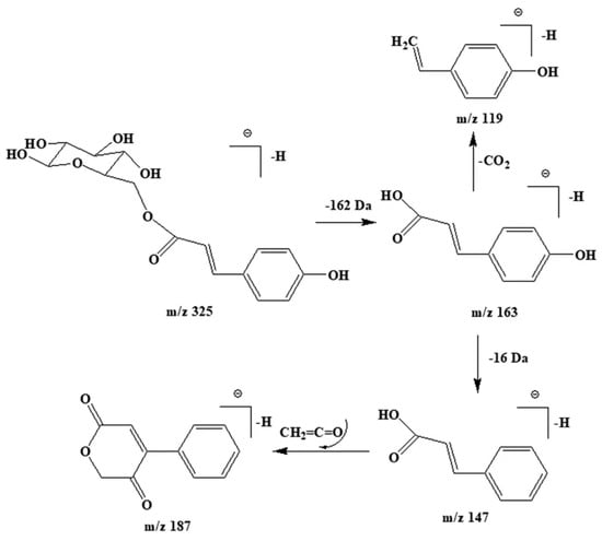 Caffeic acid’s signature fragments (m/z 179 and 135) and quinic acid’s parent ion (m/z 179) led to the identification of compound 16 as chlorogenic acid, a caffeic and quinic acid condensate, with [M-H]− at m/z 353. Compound 19, with m/z 325, generated the notable fragments m/z 163 [M-H-162]− and m/z 119, suggesting p-coumaric acid and hexose units, identified as p-coumaric hexose, possibly through p-coumaric acylation with hexose. The possible cleavage pathways of this compound are shown in Figure 3. IWO’s lignans, predominantly coniferol and pinoresinol (compounds 6 and 17), were identified by their spectra. Compound 6 exhibited a deprotonated ion at m/z 180, with guaiacyl fragments at m/z 178, 136, 124, confirming it as coniferol [29], a lignin monomer. Compound 17’s [M-H]− at m/z 357 exhibited typical lignin cleavages, yielding primary ion m/z 151 (o-methoxyphenyl) and base peak m/z 136 upon demethylation [30].