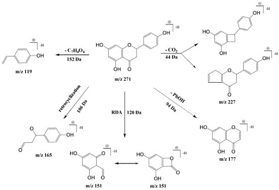 Flavonoid compound 14, characterized by two benzene rings and a pyran ring, displayed a [M-H]− parent ion at m/z 271. Collision-induced fragmentation led to a CO2 loss yielding m/z 227 [M-H-CO2]−, further losing a phenolic hydroxyl to produce m/z 177 [M-H-PhOH]−. The reverse cyclization and Retro Diels-Alder cleavage of flavonoid aglycones generated m/z 165 and 151 fragments, respectively, with m/z 119 fragments aligning with naringenin’s fragmentation pattern, suggesting that compound 14’s identity was naringenin [31]. The proposed cleavage pathways are shown in Figure 4. Compound 10 was confirmed to be abscisic acid by its [M-H]− at m/z 263 [32], retention time, and MS2 fragmentation. Compound 11’s parent ion [M-H]− at m/z 425, with fragments at m/z 263, 153, and 219, and lacking a 162 Da fragment, indicated a hexosylated abscisic acid derivative, identified as abscisic acid-o-hexoside.