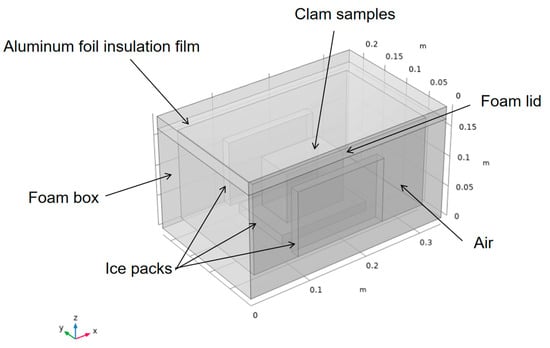 Figure 1 presents the physical geometry of the foam box. The outer dimensions of the box were 340 mm (length) × 220 mm (width) × 165 mm (height), while the internal dimensions were 300 mm (L) × 180 mm (W) × 145 mm (H). The thermostat requires insulation, such as foam, to separate the contents from the outside environment. To reduce heat transfer, aluminum foil insulation was then added to form a composite insulation layer with foam. This was followed by the addition of a source of cold, such as ice packs at −5 °C, which were placed vertically around the contents (clams). The remaining space in the interior was filled with air. The initial temperature of the contents was 5 °C.