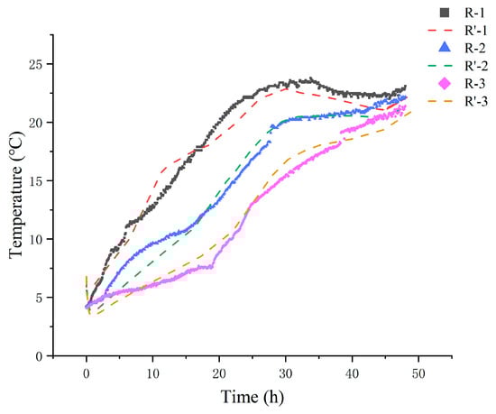 Comparison of experimental (R-) and simulated (R’-) internal temperatures of different treatments. R-1 is the group with one ice pack, R-2 is the group with two ice packs, and R-3 is the group with three ice packs.