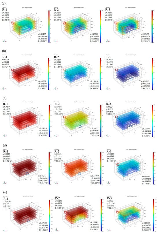 Predicted internal temperature distribution of different groups at 0 h (a), 12 h (b), 24 h (c), 36 h (d), and 48 h (e). R-1 is the group with one ice pack, R-2 is the group with two ice packs, and R-3 is the group with three ice packs. The red circle indicates the location of hot spots, and the blue circle indicates the location of cold spots.