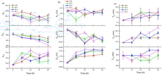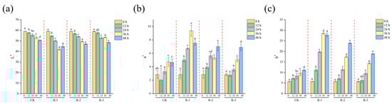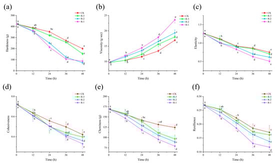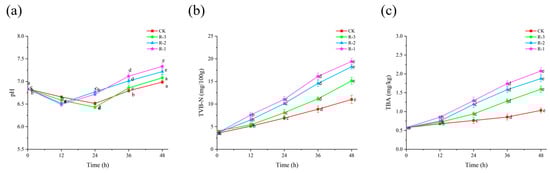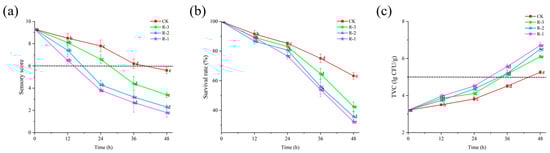 Sensory evaluation serves as the most intuitive indicator of food freshness [40]. As shown in Figure 4a, the sensory scores of live R. philippinarum in each group decreased significantly with the extension of cold chain breakage (p < 0.05). The R-1 group exhibited the most rapid decline in sensory scores, while the R-3 group showed a slower decline. Compared to the CK and R-3 groups, both of which maintained sensory scores above 8, the sensory scores in the R-1 and R-2 groups dropped to 7.4 and 6.5, respectively, after 12 h. At 24 h, the sensory scores in the R-1 and R-2 groups dropped below the rejection limit, reaching 3.8 and 4.3, respectively. As delivery extended, even the CK group, which was stored at 4 °C, experienced a decline in sensory scores below the sensory rejection limit, reaching 5.6 at 48 h. At that time, the R-3 group still exhibited a sensory score of 3.4, while rapid deterioration was observed in the R-1 and R-2 groups, with significantly low scores of 1.8 and 2.3, respectively (p < 0.05). The sensory quality of live R. philippinarum deteriorated to varying degrees due to the action of enzymes and microorganisms [41], and temperature fluctuations can further accelerate deterioration of the sensory quality of clams. These results align with findings by Li et al. [42], who reported that low temperatures can better maintain the overall sensory freshness of razor clams.