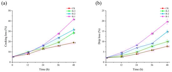 WHC was assessed by measuring cooking loss and drip loss. Cooking loss was determined based on the method of Wang et al. [29], with slight modifications. A 5 ± 0.1 g sample of clam flesh was heated at 80 °C for 5 min, then cooled and weighed. Each sample group was in triplicate, and cooking loss was calculated using Equation (13):