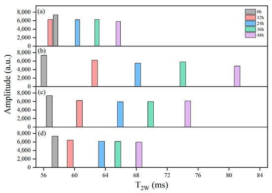 LF-NMR was performed according to the method of Wang et al. [36], with minor modifications. A PQ-001 NMR analyzer (Shanghai Niumag Analytical Instrument Co., Shanghai, China) with a magnetic field strength of 0.5 T and a proton resonance frequency of 21.3 MHz was employed. A 5.0 ± 0.01 g sample of minced clam flesh was transferred to a 15 mm NMR tube and equilibrated to 35 °C before measurement. Transverse relaxation (T2) was determined using the Carr–Purcell–Meiboom–Gill pulse sequence (CPMG). Data were collected from 2000 echoes across eight scans, with a repetition time of 4500 ms between scans and an interval of 300 μs between the 90° and 180° pulses.