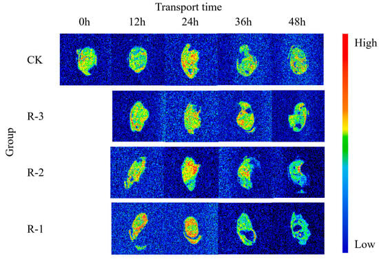 Proton density imaging of the samples was conducted using MRI, following the parameters outlined by Cheng et al. [37]. T2 weighted images were obtained using a spin-echo (SE) imaging sequence with the following settings: field of view (FOV) = 80 mm × 80 mm, three slices with a slice thickness of 1.5 mm, repetition time (TR) = 500 ms, and echo time (TE) = 20 ms. Shelled samples were placed in a nuclear magnetic tube, and adjustments were made to the signal-to-noise ratio and image clarity to obtain optimal imaging. The resulting grayscale images were then subjected to pseudo-color processing to enhance visual interpretation.