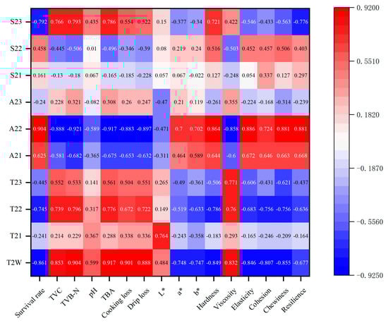 Pearson correlation analysis was used to explore the relationship between LF-NMR results and physicochemical parameters. In this analysis, the effects of the treatments were not considered, and the mean values across all treatments were used.