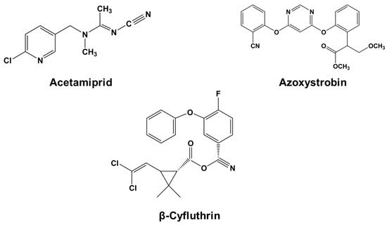 Pepper is a fundamental and nutritional food in Asian and Latin cuisine. Moreover, it is widely appreciated and in great demand in international markets. Mexico is in first place in exports and fourth in production, only surpassed by China, Turkey, and Indonesia [6]. In 2022, Mexico produced 3,112,480.69 tons, valued at $ 36,585,968.35; however, by 2030, production is estimated to increase to more than 4.49 million tons, of which 2.11 million is estimated to be exported, representing a commercial value of 4108.98 million dollars [7,8]. The jalapeño pepper (spicy) is the most produced variety, with 703,420 tons. Sinaloa state is the second-largest producer, standing out for its quality and yield (42.08 tons/ha) [8]. Some of the pesticides, mainly used for pest control in jalapeño pepper, are acetamiprid, which is a broad-spectrum neonicotinoid insecticide, β-cyfluthrin, a pyrethroid insecticide, and azoxystrobin, a broad-spectrum systemic strobilurin-type fungicide (Figure 1).