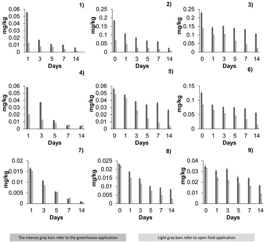 In all graphs, dark grey bars represent residues from greenhouse applications, while light grey bars represent residues from open-field applications. The figure illustrates the dissipation patterns of each pesticide across multiple applications, highlighting the differences between greenhouse and open-field conditions.