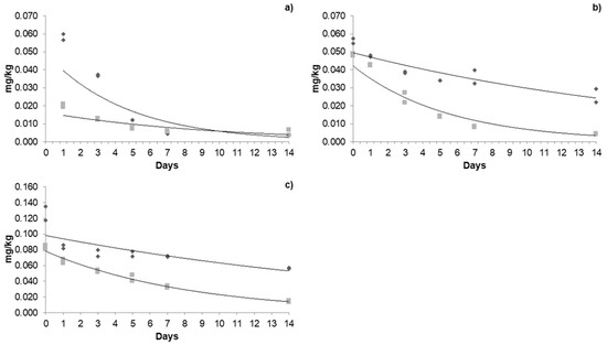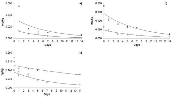 For instance, the persistence of pesticides is generally expressed in terms of half-life (t1/2), i.e., time for disappearance of pesticide to 50 percent of its initial concentration, which could be expressed using a first-order equation (see Equation (3)), in which the constant k is the slope of the linear regression. In general, the highest concentrations were recorded on the day of application for the three pesticides; however, the residues decreased exponentially over time. In addition to degradation due to climatic conditions, the fruits, when exposed to the active ingredients, begin a detoxification and metabolization process through the chemical reactions of oxidation, reduction, hydrolysis, and conjugation to glycosides, which are metabolized more quickly [25,43].