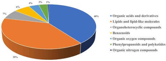 Furthermore, the high-confidence annotations of NVOAs were analyzed for categorization (Figure 1). The results showed that 201 NVOAs could be categorized (superclass level) into organic acids and derivatives (n = 80), lipids and lipid-like molecules (n = 78), organoheterocyclic compounds (n = 14), benzenoids (n = 13), organic oxygen compounds (n = 8), phenylpropanoids and polyketides (n = 7), and organic nitrogen compounds (n = 1). Among the NVOAs in the organic acids and derivatives superclass, the subclass of amino acids, peptides, and analogues was the most abundant and has been reported to directly affect the taste and biological activity of Baijiu [22]. Specifically, L-norvaline was first detected in Baijiu, which was reported to be a non-protein branched-chain amino acid with a bitter taste [23]. Pipecolic acid, a cyclic iminic acid found in plants, is considered a neuromodulator and was also first identified in Baijiu [24]. Furthermore, at the superclass classification level, NVOAs associated with lipids and lipid-like molecules accounted for the second largest group. Notably, a significant number of fatty acyls were identified, which have not been previously reported in Baijiu [2,7,12,25]. Overall, the CIL-HRMS significantly expands the understanding of NVOAs in Baijiu.