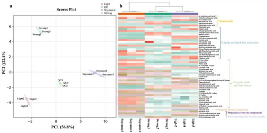 The (a) scores plot of principal component analysis and (b) clustering heatmap of different flavor types of Baijiu. QC = quality control; Light = light flavored Baijiu; Soysauce = soy sauce flavored Baijiu; Strong = strong flavored Baijiu.
