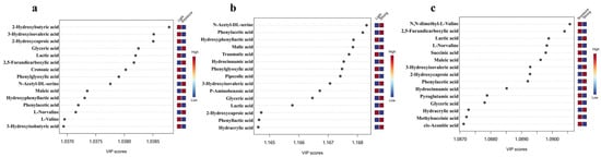 The top 15 of variable importance of the projection values of non-volatile organic acids between different flavored Baijiu. (a) light flavored Baijiu vs. soy sauce flavored Baijiu, (b) light flavored Baijiu vs. strong flavored Baijiu, as well as (c) strong flavored Baijiu vs. soy sauce flavored Baijiu. Light = light flavored Baijiu; Soysauce = soy sauce flavored Baijiu; Strong = strong flavored Baijiu.