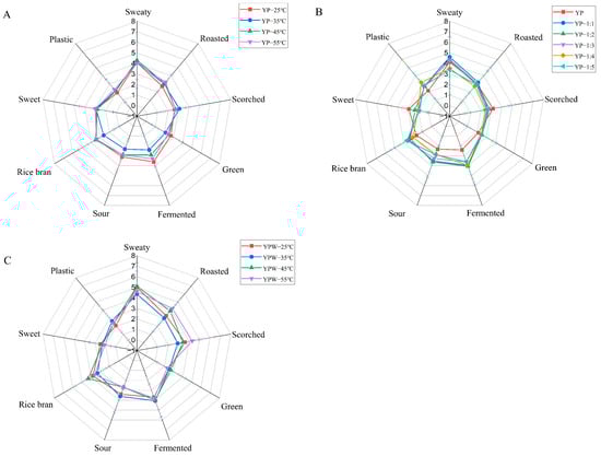 The quantitative descriptive analysis was performed to obtain the overall aroma profile of YPs at different temperatures (Figure 1). Results showed that the intensity of sweaty, fermented, and rice bran aromas of YPs were the highest after heating at high temperatures, followed by roasted, scorched, green, and sweet notes. The difference among the YP samples was the most pronounced in sweaty aroma compared with the other YPs. The YPs heated at 35 °C had the lowest value of overall aroma intensity, so the YPs heated at 35 °C were chosen for the subsequent studies. Figure 1B shows the aroma characteristics of YPs after the reintroduction of pure water, and the intensities of sweaty, fermented, and sour differed greatly from those of the dry YPs after the addition of water. The aroma intensities of YPs after water addition were not significantly changed, but it was different from the dry YPs. Figure 1C shows the aroma characteristics of YPs after the addition of water under heating at different temperatures. The intensities of sweaty, scorched, and fermented aromas were the highest after the addition of water, followed by roasted, rice bran, and sweet notes, and the intensities of plastic and green aromas were the lowest.